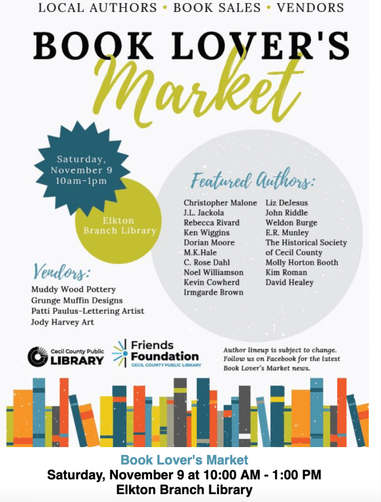 ‘Tis the season for book signings because we all know that books make some of the best gifts. Plus, it’s just nice to get out from behind the keyboard and see actual people. Cecil County Public Library, Elkton Branch, Book Lovers Market November 9, 10-1. Many local authors will be there to sign books and…