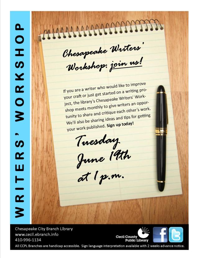The first Chesapeake Writers’ Workshop will be held at 1 p.m. Tuesday, June 19 at the Chesapeake City Branch Library. From then on, we’ll be meeting on a regular basis to share our work.  At future workshops, you are welcome to bring another chapter from the same work, or share something new.  This is a free workshop offered by the Cecil County (Maryland) Public Library and moderated by David Healey. You can sign up here.