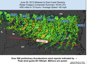 While other areas of the country do experience a derecho-type storm at least once a year, it’s very rare in the Chesapeake region. The one that struck in 2012 actually originated in the midwest and charged all the way to the Atlantic in just about six hours. This was a vast, powerful storm that stretched across a front of about 240 miles. Experts say it was probably a long stretch of really hot weather that triggered this derecho.