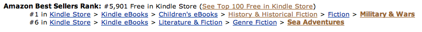 Sea Lord rankingFIRST VOYAGE: THE SEA LORD CHRONICLES sailed into the top listings for its categories (No. 1 in “military and war” for children and No. 6 for “sea stories” in general).  Huzzah!