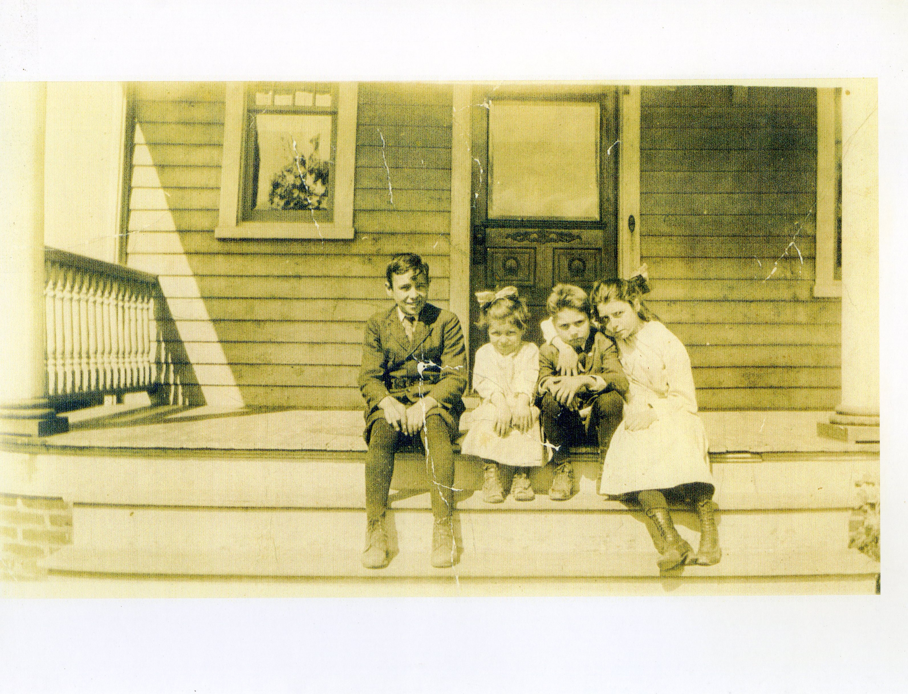 These are the Cooling children on the front porch of our house, probably in the 1920s. The boy second from the right is Walter Cooling, who once stopped in to visit and pointed out that we still had the same clawfoot tub he grew up with! The front door is also the same. Thanks to Robert Hazel for the photograph.