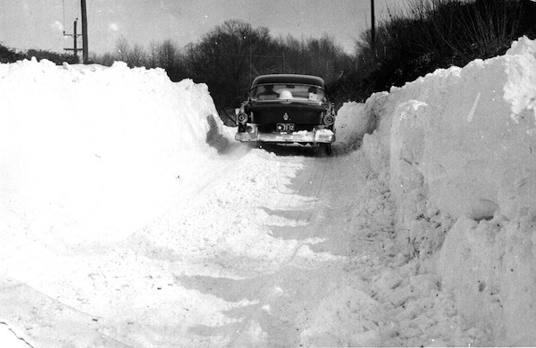 A car makes its way down a plowed road after the big snow of 1958. PHOTO COURTESY HISTORICAL SOCIETY OF CECIL COUNTY/GREAT STORMS OF THE CHESAPEAKE